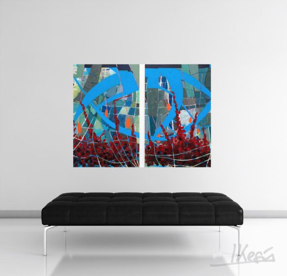 Within each panel, layered shapes oscillate between structure and dissolution. Gestural lines and solid blocks suggest weight and resistance, while softer transitions imply a gradual yielding. The diptych format reinforces the sense of opposing forces at work: attraction and restraint, advance and hesitation. Rather than resolving this tension, the painting holds it in balance, allowing the viewer to sense the pull as an ongoing condition rather than a completed action.