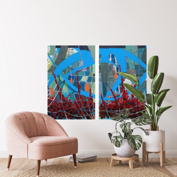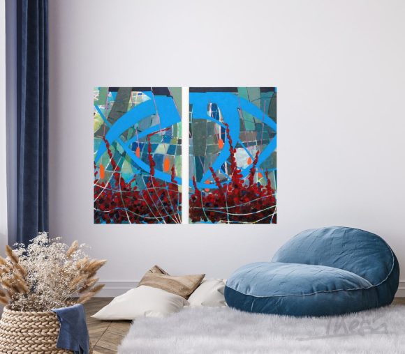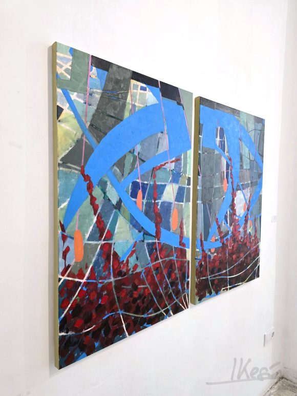 “The Pull” unfolds across two panels, setting up a tension between separation and connection. The forms appear stretched and drawn across the divide, as if responding to an unseen force that operates between the canvases rather than within either one alone. This spatial gap becomes active — a charged interval where movement, pressure, and alignment are negotiated.
