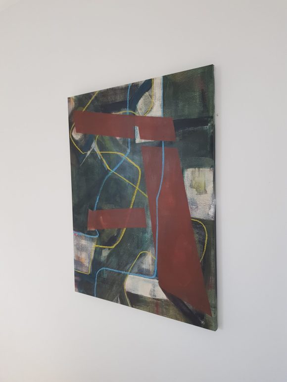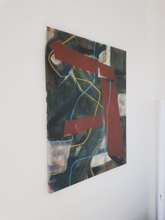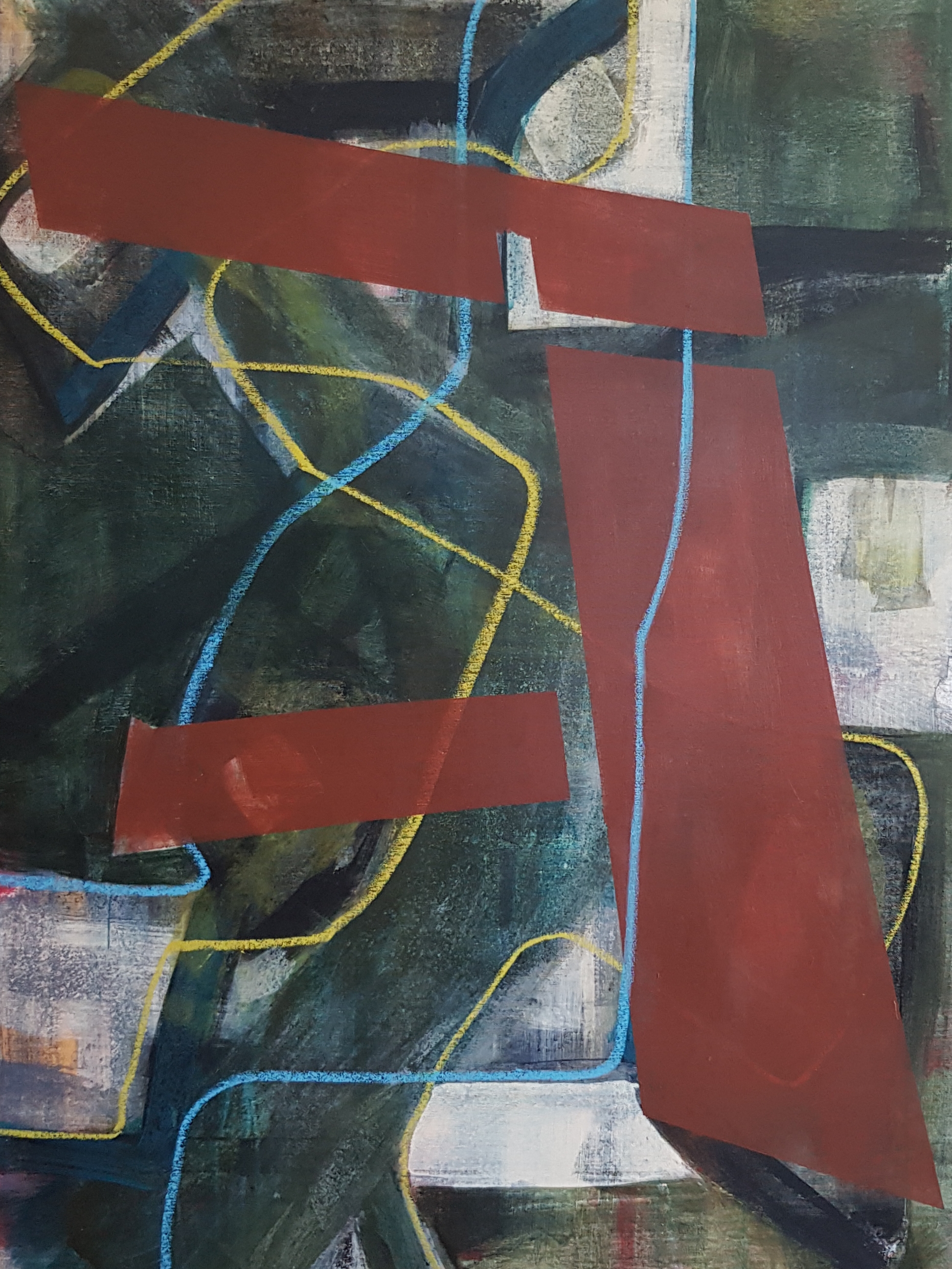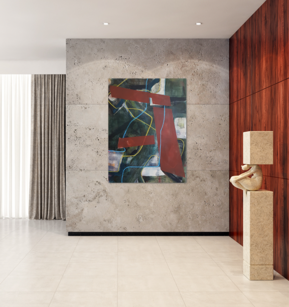 “Urban Strata” works with a language of intersecting planes, textured grounds, and sharply defined shapes, creating a sense of layered construction. The red forms cut across the composition with a decisive, structural force, while the underlying marks and translucent passages reveal traces of earlier movements and shifting spatial intentions.