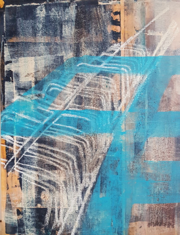 On top of this lattice, a vivid blue-turquoise symbol introduces a different register, as if another signal or layer of meaning were intersecting with the relic. Its clarity contrasts with the austerity of the white forms, suggesting a dialogue between what survives, and what becomes undecipherable over time.