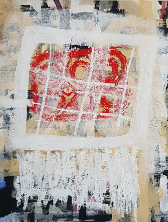 Colour seeps through this grid, softening authority and distancing it from the object it overlays. The painting holds both the residue of everyday use and the imposition of meaning across time, where reality dissolves, and systems of control survive only as symbols shaped by centuries of forgetting.