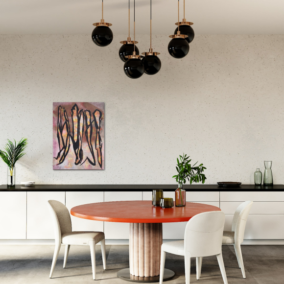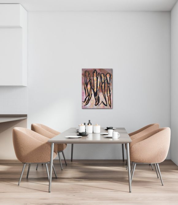 “Adjustment,” from the Mindscapes series, centres on the shifting rhythms of a mind responding to change. Dark linear contours move across the canvas in ways that suggest forms in transition — shapes that feel momentarily held before slipping into something new.