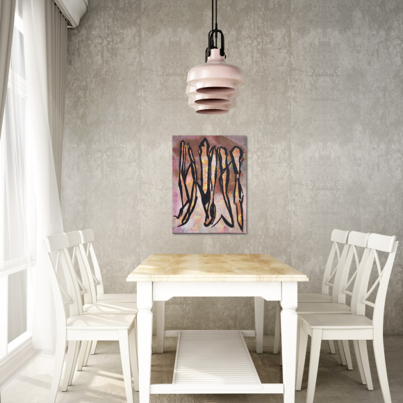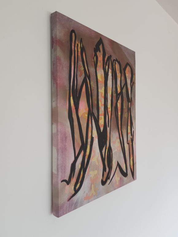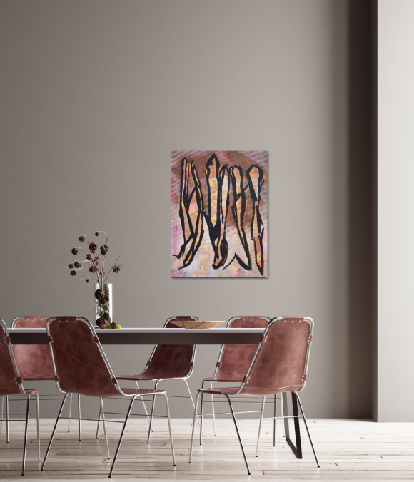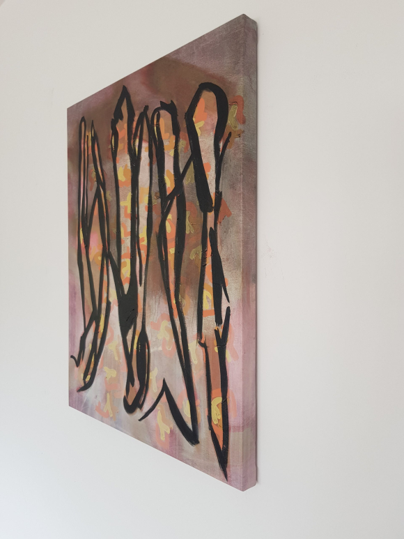 Warm tones of pink, orange, and yellow introduce an emotional pulse, carrying both intensity and openness. These colours settle over a textured, layered surface where earlier marks remain partly visible, creating the sense of a space that is continually reconfiguring itself.