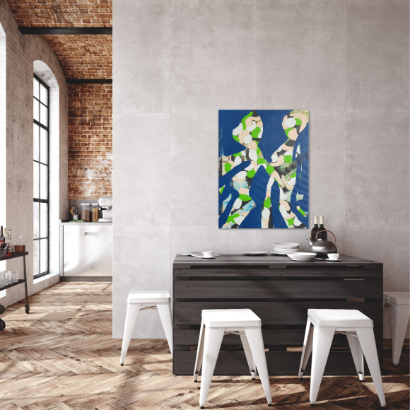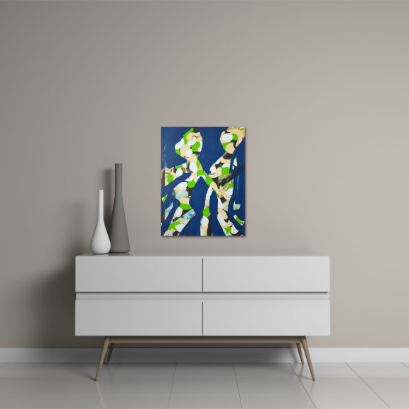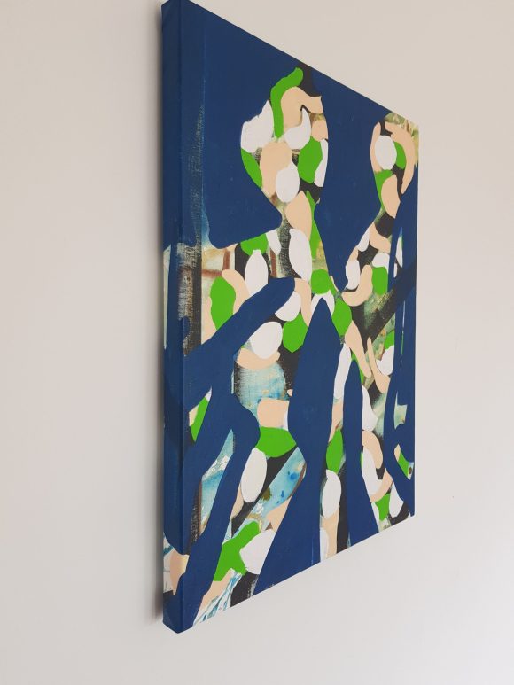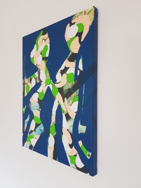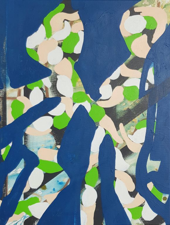“Out of the Blue” presents two patterned, figure-like forms appearing from beneath a vivid blue surface, as if suddenly brought into focus. The opaque blue layer acts as both barrier and threshold, partially concealing the underlying structures while allowing these forms to push forward with unexpected clarity. Their patterned interiors carry traces of earlier gestures, hinting at histories or emotional currents that have resurfaced without warning.